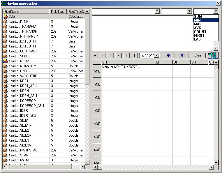 In the version 2.0 the opportunity is added to impose conditions in group queries (HAVING). Having pressed the button "Having" will open the form (Fig.1) similar by the form and rules of work to the form with usual filters (Where). The unique difference is, that all elements of the structure, not getting in a condition of grouping, in query (Group by) should by a part of aggregate functions (for more detailed look a rule of construction SQL).