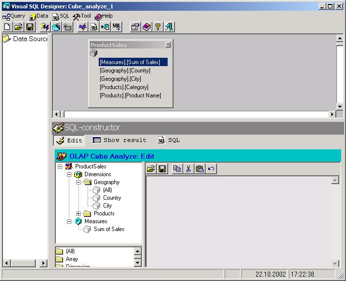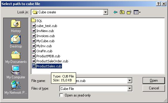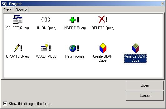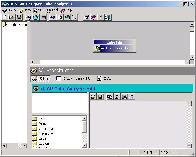 Choose menu item "Query\New" in the main menu of the program. In the opened dialogue choose an icon "Analyze OLAP Cube" (Pic.1). Enter the name of new query in the opened dialogue (Pic.2). Press the right button of the mouse on a working region of the program. In the opened menu choose item "Add External Cube" (Pic.3). Choose cube file which you want to analyse in the program (Pic.4). After a choice of a cube file You may see a new table in working area of the program. Choose mode EDIT and You can see structure chosen cube file (Pic.5).