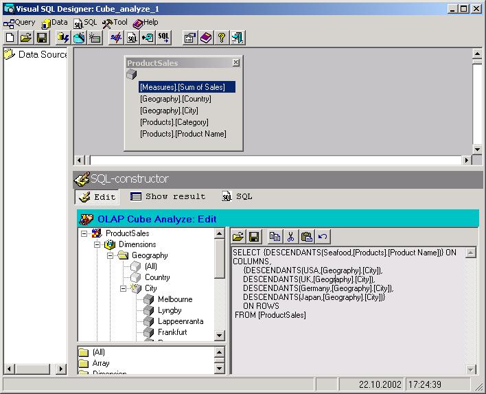 You can see in a editing window all measurements of a cube. And their values which you can receive in a tree of a cube by clicking twice on the left button of the mouse on appropriate dimension are accessible to you (Pic.6). For creation a query simply drag the value chosen you from a tree of measurements of the cube to working SQL area and drop it. For your convenience there is an opportunity of a choice standard templates of MDX which are grouped on categories in tree. You can keep the expression created by you in a file. And also can load the kept early expression from a file on a disk. To execute the query created by you is simple enough to click on button "Execute" on the main toolbar of the program.